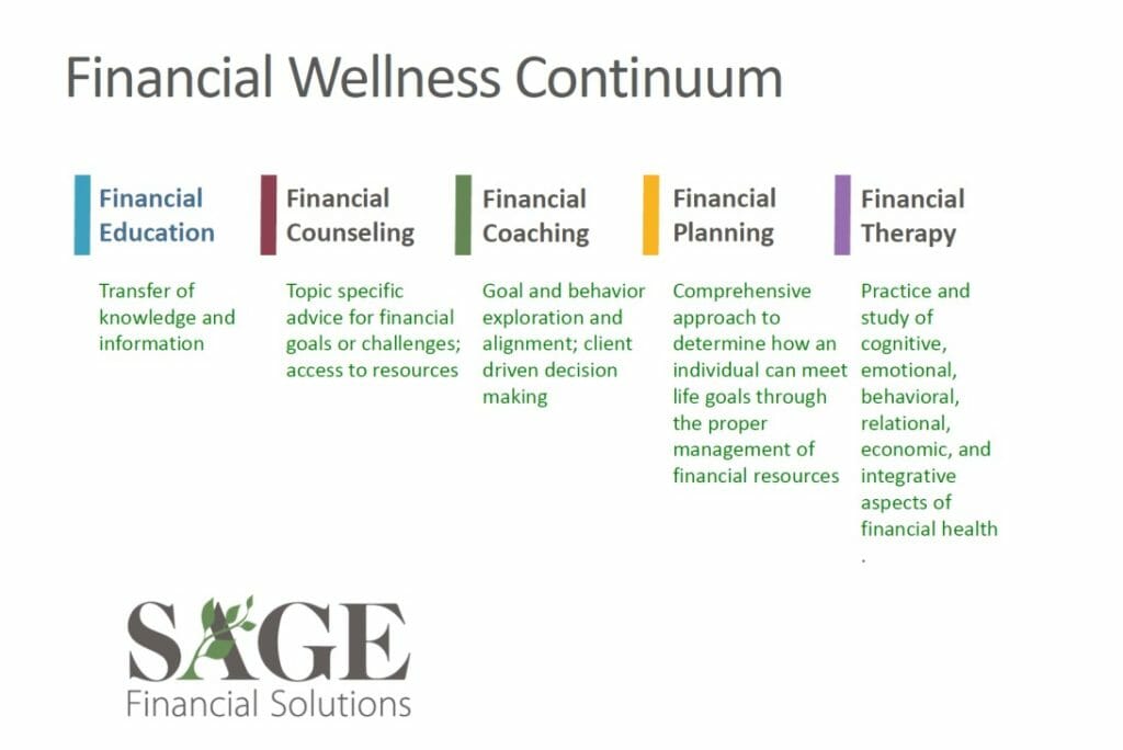 While there are many areas of specialty in the field, like divorce financial analysts or daily money managers and CFP professionals, we are focusing on five broader categories to define the continuum of care: financial education, financial counseling, financial coaching, financial planning, and financial therapy. The continuum of care does not represent a linear approach, but rather identifies specific areas of expertise to build a fluid and integrated service model for more efficient and holistic client service, similar to a medical triage team of experts for healthcare patients.