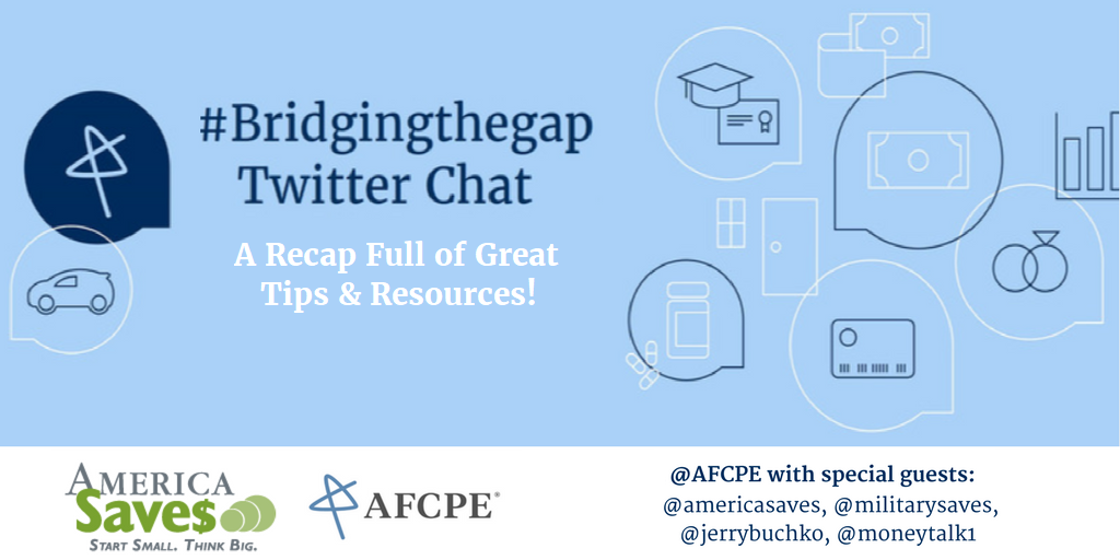 On Tuesday February 27, @AFCPE hosted a Twitter Chat to discuss ways to overcome obstacles to successful savings and offer suggestions and tips on #bridgingthegap. We had a great turnout with lots of information shared!