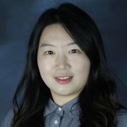 Award winner Yoon Lee smiling in front of a partially patterned grey background wearing black glasses and a black sweater